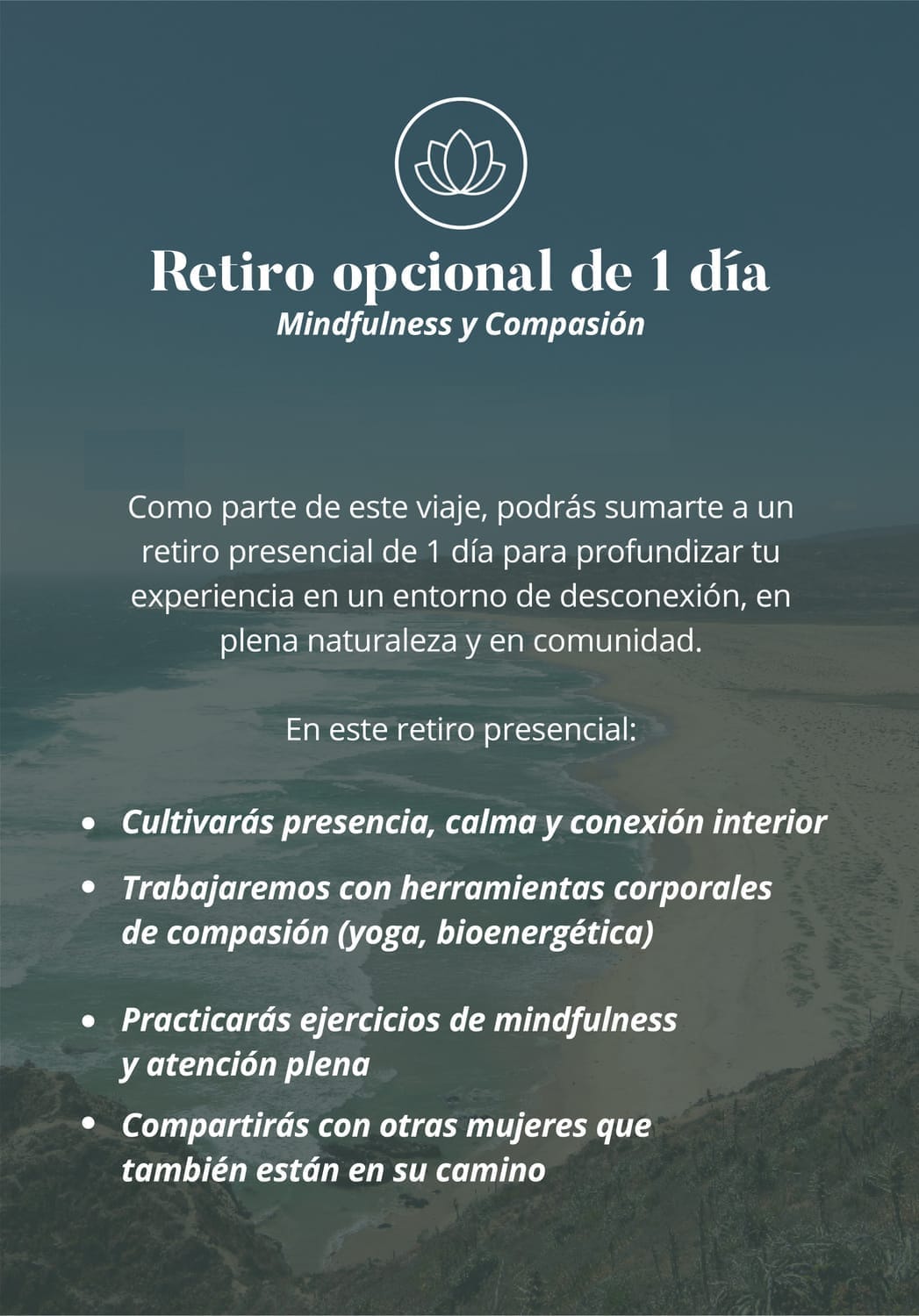 Como parte de este viaje, podrás sumarte a un retiro presencial de 1 día para profundizar tu experiencia en un entorno de desconexión, en plena naturaleza y en comunidad.