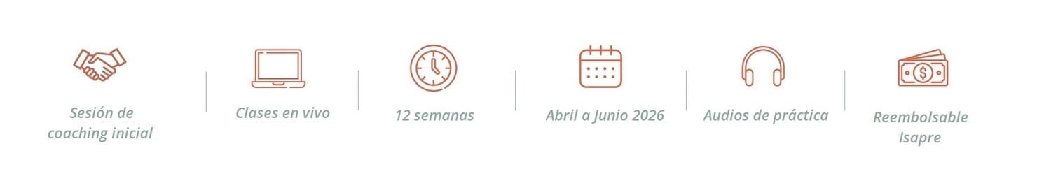 Son encuentros grupales online de 2,5 horas donde trabajamos contenidos, ejercicios prácticos y vivencias del grupo, todo guiado por mí.