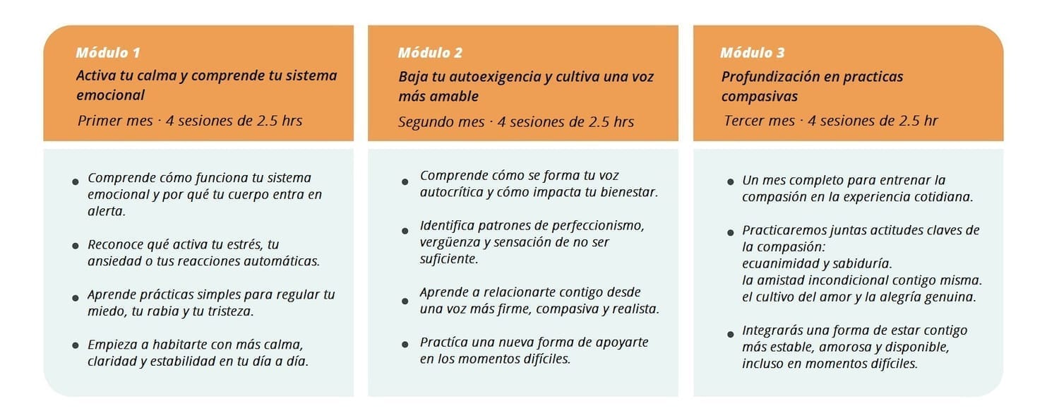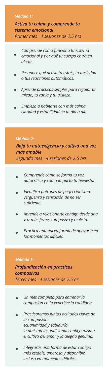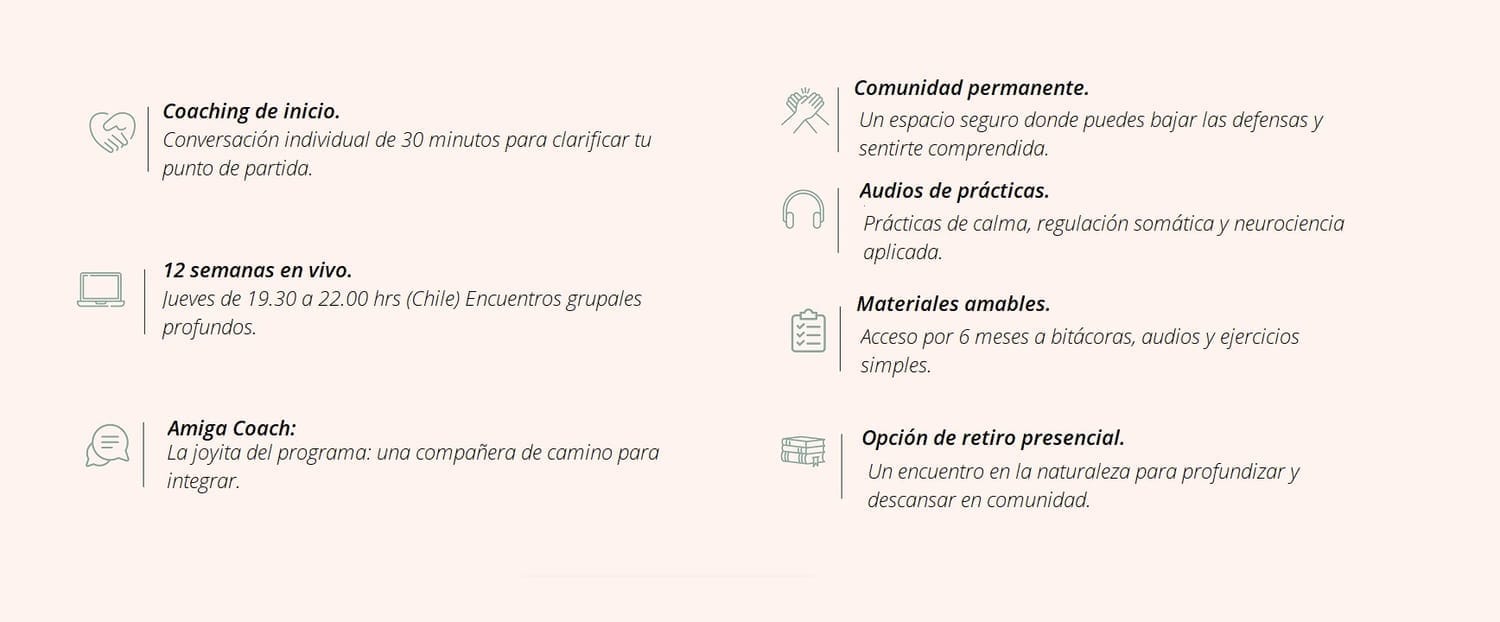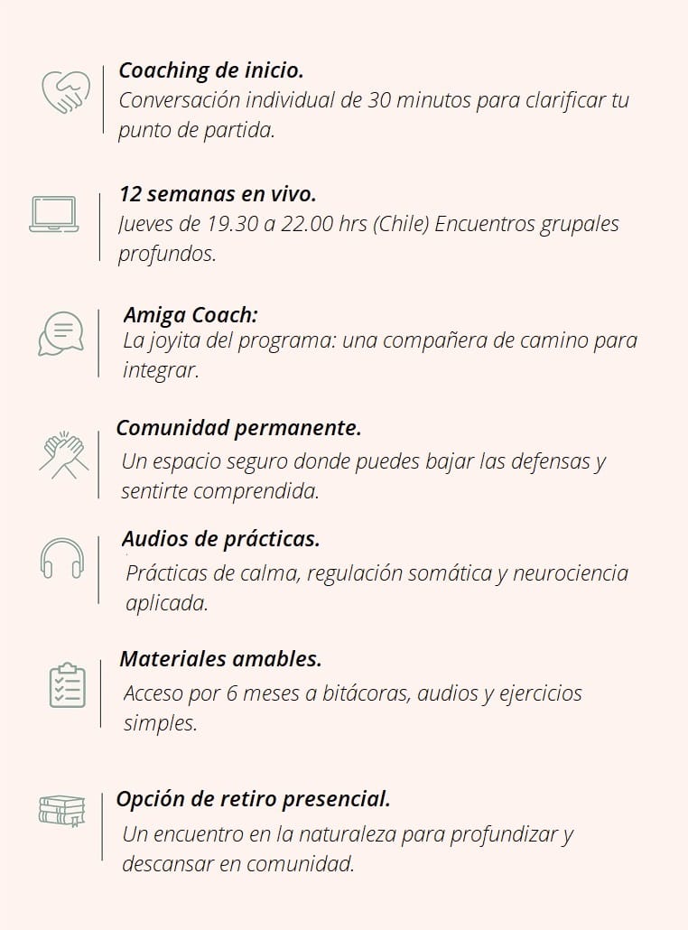 En 12 semanas vas a aprender a dejar de exigirte cuando estás mal, a entender lo que te pasa por dentro y a acompañarte sin culpa, sin dureza y sin sentir que fallas.